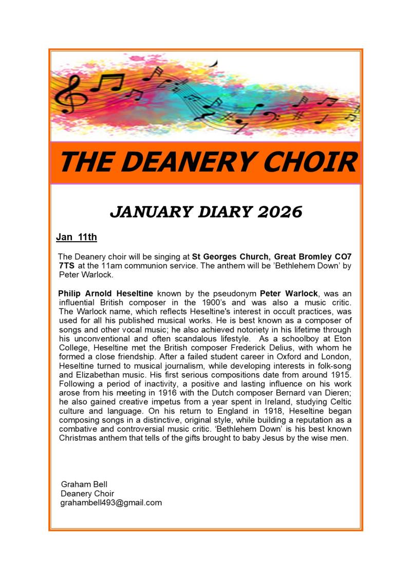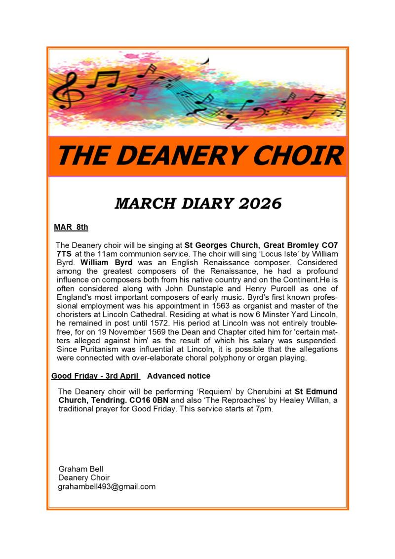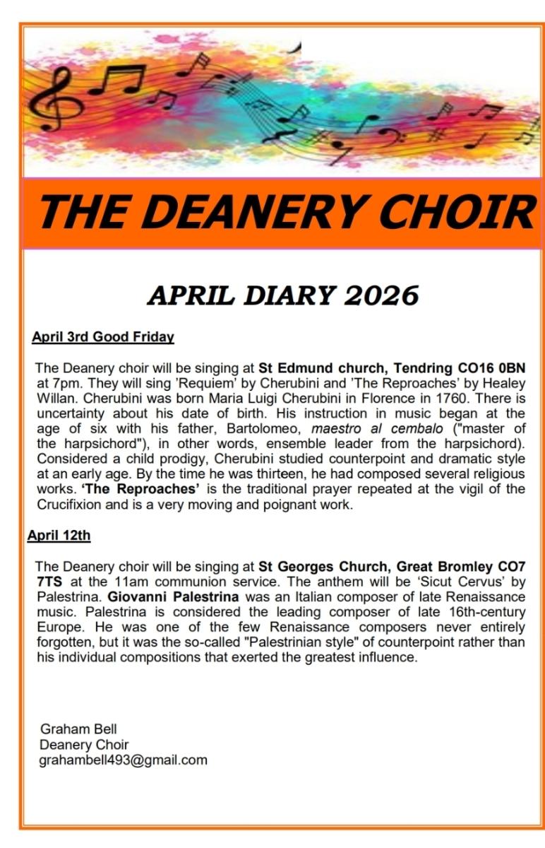 The Deanery Choir supports the music in the Harwich Deanery area and is available to supply music for: